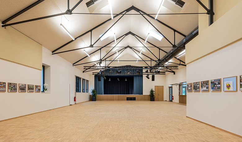 L’entrée principale de la salle des fêtes s’effectue désormais de plain-pied depuis la rue, facilitant l’accès au public. Le foyer d’accueil, dimensionné pour répondre aux exigences fonctionnelles du centre culturel, est précédé d’un parvis partiellement couvert par un auvent.