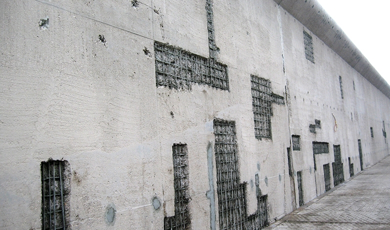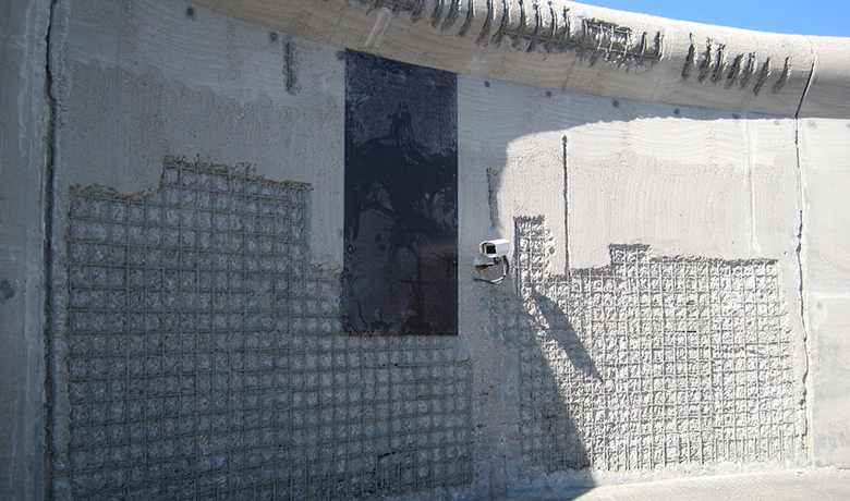 Nombre des structures extérieures en béton apparent du site, dont notamment les murs d’enceinte et les murs de séparation entre les différents blocs, ont souffert sous l’exposition aux intempéries et aux agents de l’air ambiant, parmi lesquels le dioxyde de carbone qui provoque la carbonatation du béton et, en conséquence, la corrosion des armatures en acier de ce béton. Or la corrosion de l’acier entraine une augmentation en volume des barres d’armatures laquelle conduit finalement à des éclatements du béton.