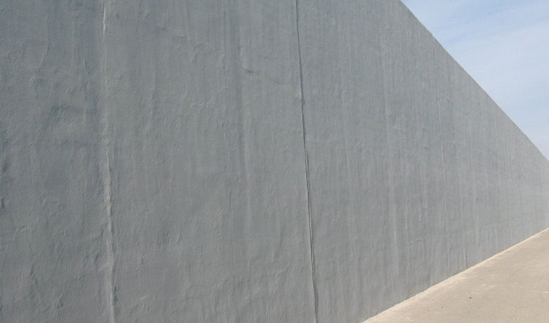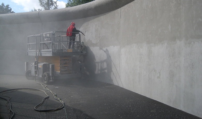 Toutes les surfaces de béton apparentes ont été nettoyées à l’eau sous ultra haute pression. Les parties de béton dégradées ont été décapées en profondeur par le même procédé, puis les armatures mises à nu traitées contre la corrosion et les surfaces décapées ont été ragréées au mortier adapté. Finalement, un système de finition en quatre couches a été appliqué sur l’ensemble des surfaces assainies dans le but de protéger les murs durablement contre la pénétration d’agents agressifs.