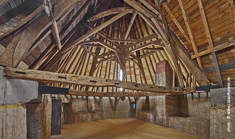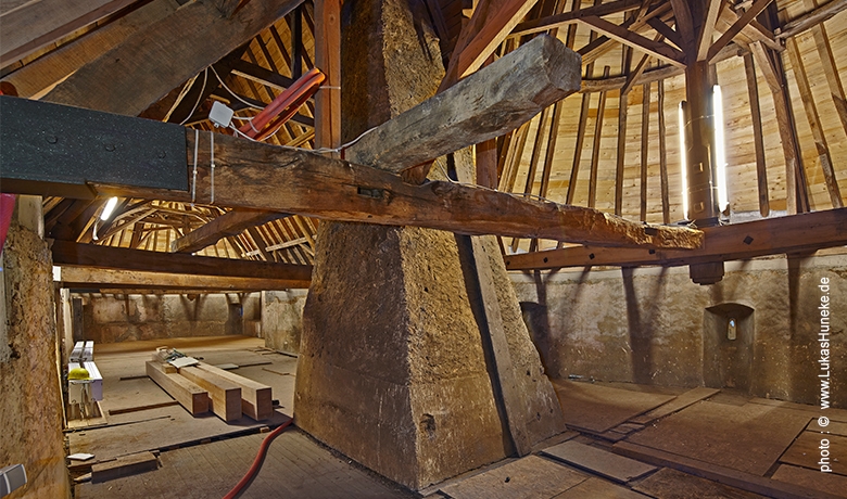 La majeure difficulté des travaux résidait dans le fait qu’un cordon périphérique en béton devait être mis en place en tête des murs de façade sur lequel prend appui la toiture sans que la structure portante en bois de la toiture ne soit démontée. Pendant les différentes phases de ces travaux, des parties de la toiture ne reposaient que sur des structures d’étayage provisoires. Le cordon périphérique réalisé en coordination avec les travaux de charpente en bois stabilise désormais les têtes de murs périphériques des façades.