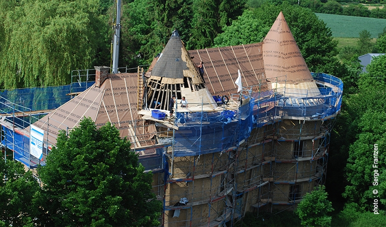Ces travaux ont eu notamment comme but de renforcer et de remplacer les éléments défaillants de la structure en bois existante des toitures datant du 16ième siècle et d’appliquer une isolation thermique du côté extérieur du voligeage existant.