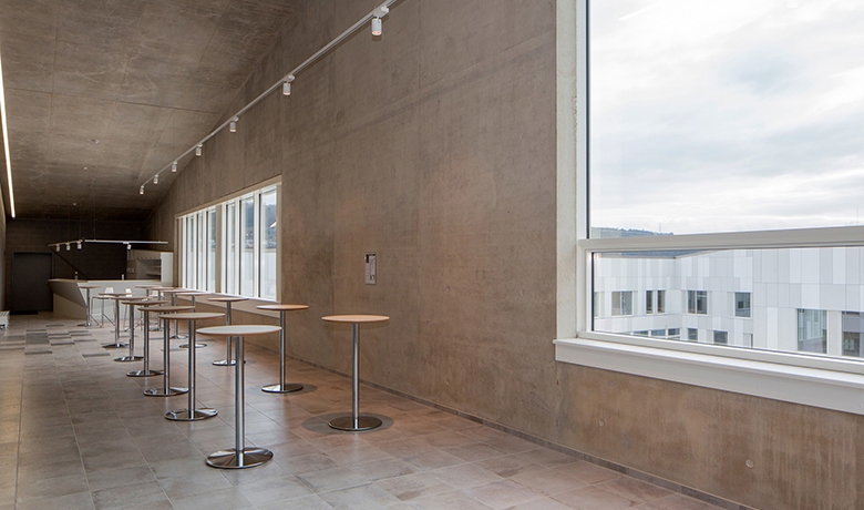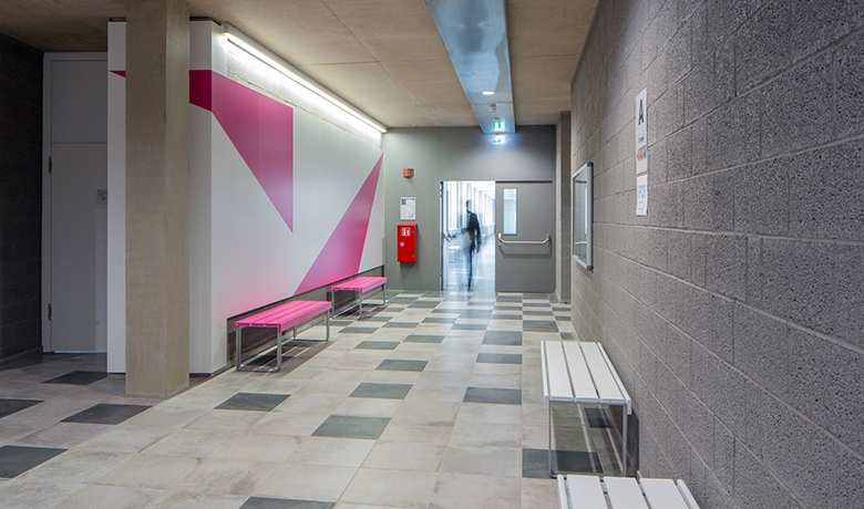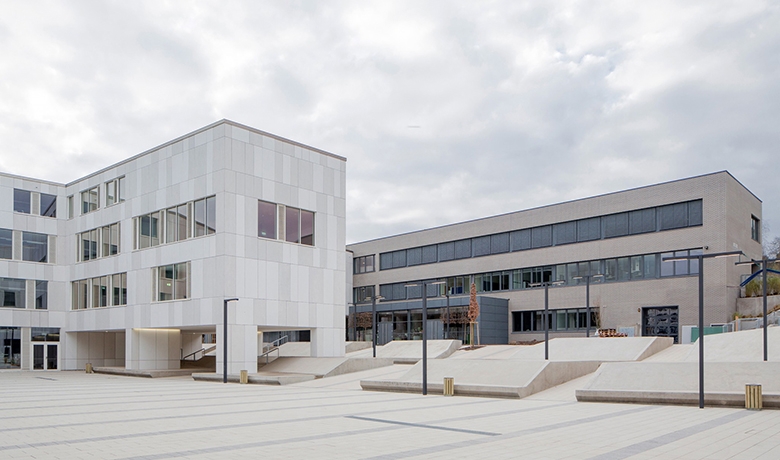 Der Neubau wird durch eine 2-stöckige Passerelle im 2. und 3. OG mit dem benachbarten Schulgebäude verbunden. Diese Passerelle wurde als Ortbeton-Hohlkasten hergestellt, die Zwischendecke als Verbunddecke (ausbetonierte Trapezbleche auf Stahlträgern), die wiederum durch Stahlseile an der Dachdecke aufgehängt wurde.