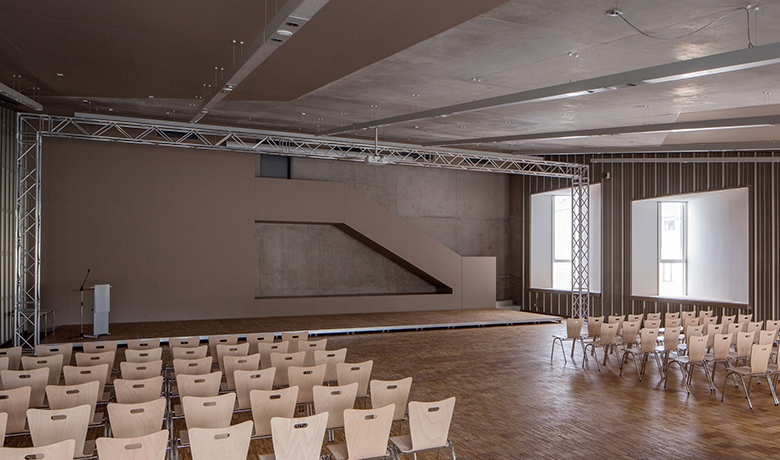 Besonderheit ist der im oberen Geschoss liegende Festsaal, der über die gesamte Breite des Gebäudes stützenfrei bleiben sollte (Spannweite 22,50 m). Um dies realisieren zu können kam eine sog. „COBIAX“-Decke zur Ausführung, d.h. eine 60 cm starke Ortbetondecke, in die kugelförmige Hohlkörper von 45 cm Durchmesser zur Gewichtsersparnis eingelegt wurden.