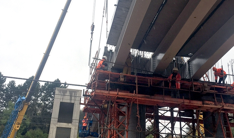 Après la réalisation de la pile centrale, composée de 4 colonnes, et des culées, les 16 poutres métalliques avec leurs prédalles collaborantes ont été posées lors d’un barrage de la ligne ferroviaire. Le tablier, d’une largeur totale de 16,10 m, a été bétonné lors de plusieurs phases de bétonnage dans les semaines suivant la pose des poutres. La liaison avec l’arrêt ferroviaire se situant en dessous de l’ouvrage se fera quant à elle grâce à quatre escaliers et deux ascenseurs qui se situeront de part et d’autre du tablier.