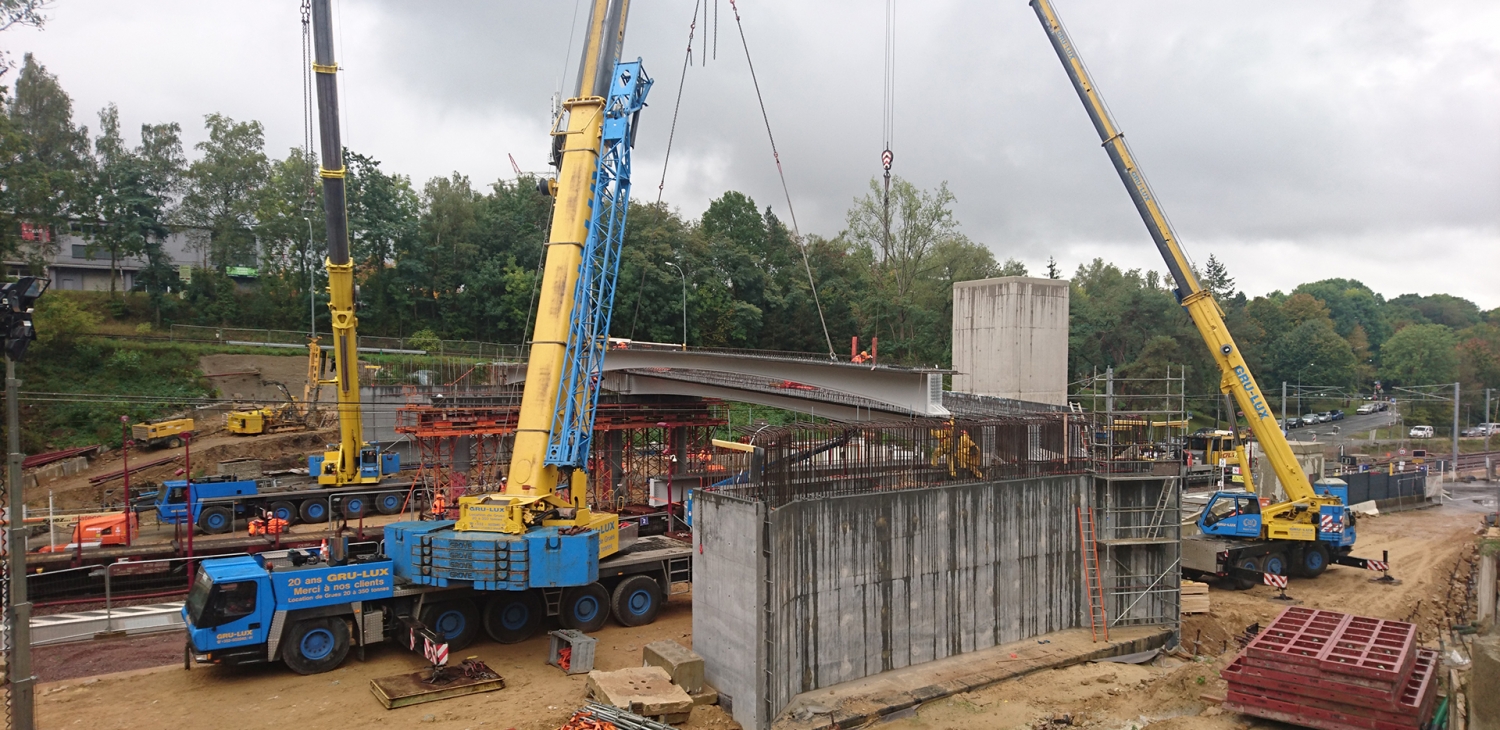 Luxembourg-CentsDans le cadre du projet « Mise à double voie du tronçon Hamm-Sandweiler de la ligne Luxembourg – Wasserbillig », la suppression du passage à niveau PN56 de Cents est un élément prépondérant qui permettra d’augmenter la sécurité routière, ferroviaire, et piétonne. Pour ce faire, un pont enjambant la ligne ferroviaire Luxembourg-Wasserbillig avec l’arrêt ferroviaire Cents-Hamm et liaisonnant la route nationale N2 (Val de Hamm) avec la rue des Alouettes à Cents est en cours de réalisation.
