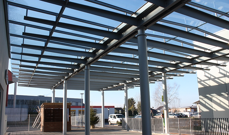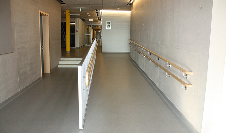 Concernant les différents matériaux de construction, leur choix varie entre le béton armé (ordinaire et apparent) et la maçonnerie pour les éléments porteurs et l’acier pour la charpente métallique du grand hall. Le volume de la salle polyvalente est partiellement réalisé en bois par des grands éléments massifs préfabriqués, qui ont permis un montage rapide.