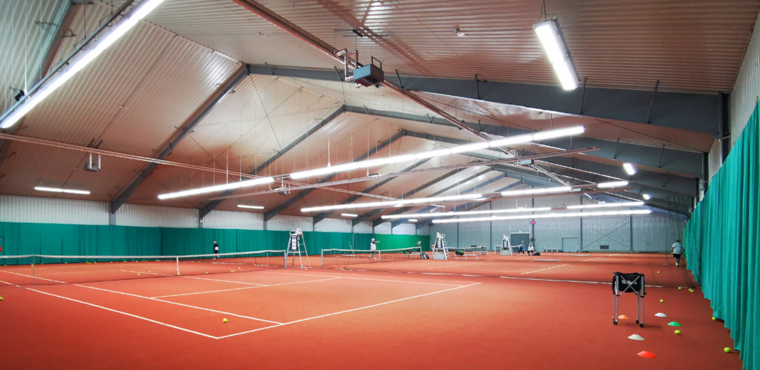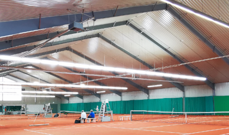 Une protection de la charpente a pu être évité par simple compartimentage par vitrage E30 par rapport au restaurant (pizzéria) attenant au hall de tennis, afin de garantir les hypothèses de charge au feu prises en compte.
