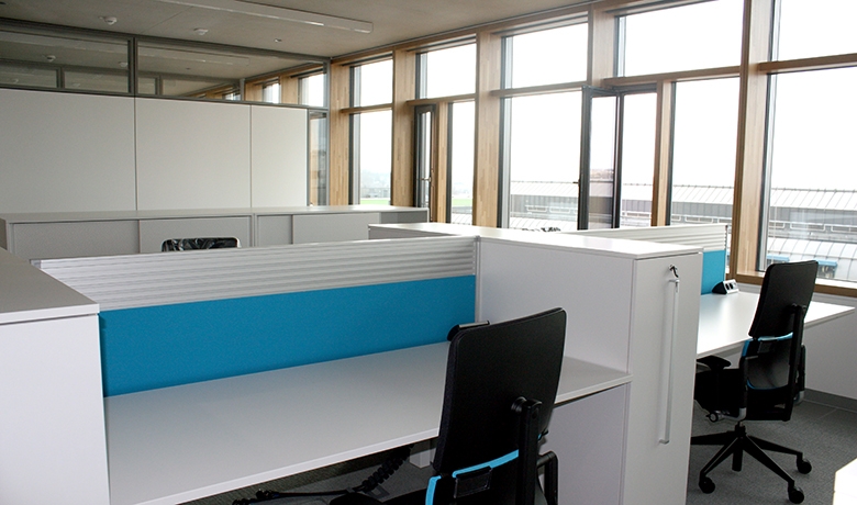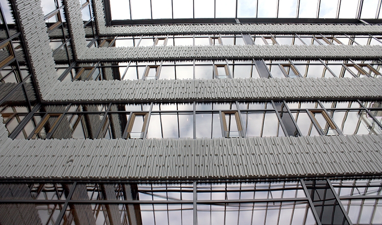 La structure du bâtiment est réalisée en béton armé avec des dalles massives sur piliers (entraxes 8,10m x 5,40m). Ces « dalles actives » incluent un système de tubes intégrés permettant d’utiliser la masse du béton pour le stockage et l’échange d’énergie thermique. Afin d’optimiser l’apport de lumière naturelle, ces mêmes dalles sont exécutées en béton apparent de teinte très claire.