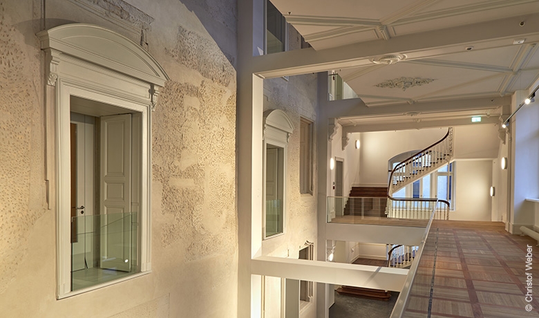 La mise en valeur de la façade Renaissance avec ses anciennes ouvertures, contre laquelle une extension au XIXe siècle a été adossée, constitue un apport majeur de ce projet. Les planchers de cette extension ont été découpés le long de la façade Renaissance pour la découvrir sur toute la hauteur ainsi que pour donner place à une ambiance plus ouverte et conviviale, alliant espaces généreux, clarté et éléments de décor.