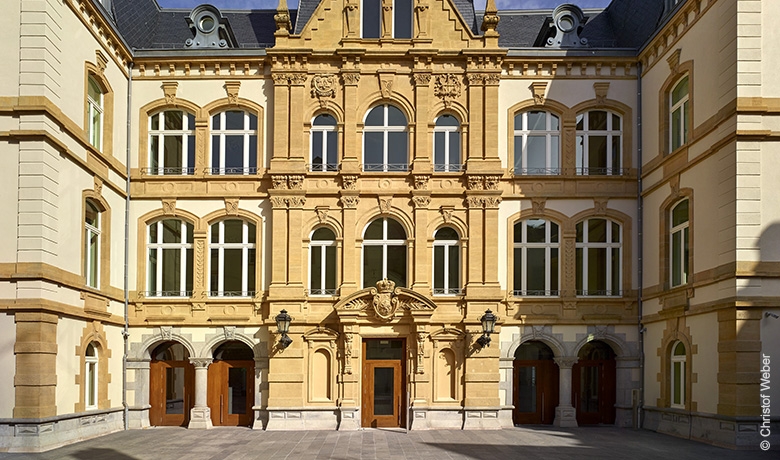 Luxembourg-VilleL’ancien Palais de Justice, situé en plein centre de la Vieille Ville de Luxembourg, a été réaménagé en un bâtiment administratif pour le Ministère des affaires étrangères et européennes. Après un concours d’architecture en 2010 et la désignation des bureaux d’études, les travaux préparatoires ont commencé en 2012 (fouilles archéologiques, désamiantage, etc.). Les travaux proprement dits ont démarré en 2013. Avant la réhabilitation, l’ancien Palais de Justice avait un volume construit de 35.000 m3. La présente intervention architecturale a permis d’ajouter environ 5.200 m3 par la construction de nouveaux volumes en rez-de-jardin, notamment la nouvelle salle multifonctionnelle et une cuisine, des sous-sols créés dans la roche ainsi qu'au 2e et 3e étage par le rehaussement de la toiture à l’extrémité de l'aile Nord.