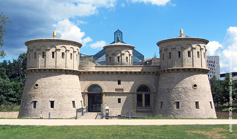 Luxembourg KirchbergC’est l’ancien réduit du Fort Thüngen au Kirchberg qui abrite aujourd’hui le Musée Dräi Eechelen. L’exposition permanente a intégré les anciennes casemates au rdc, les expositions temporaires se tiennent dans une salle nouvellement conçue au 1er étage, les galeries souterraines et les mines du sous-sol ont été laissées en l’état.