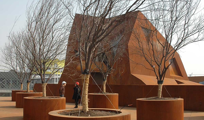 Les concepteurs du pavillon ont imaginé une forme sculpturale quasi monlithique influencée par la traduction en chinois du nom "Luxembourg". en chinois, "lùsen bâo" signifie "forêt et forteresse". Le pavillon luxembourgeois se veut une forteresse ouverte, baignée de verdure. La structure architecturale du pavillon ressemble à des remparts entrecoupés de larges ouvertures donnant sur les espaces voisins et entourant une sorte de tour médiévale. Celle-ci arbritera un espace culturel et multifonctionnel servant de point de rencontre pour toutes les nations et cultures.