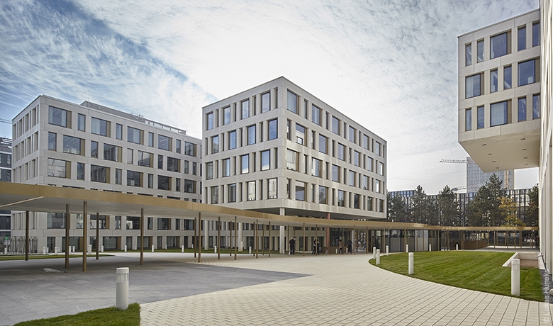 der vier Bürogebäude gelangen kann.