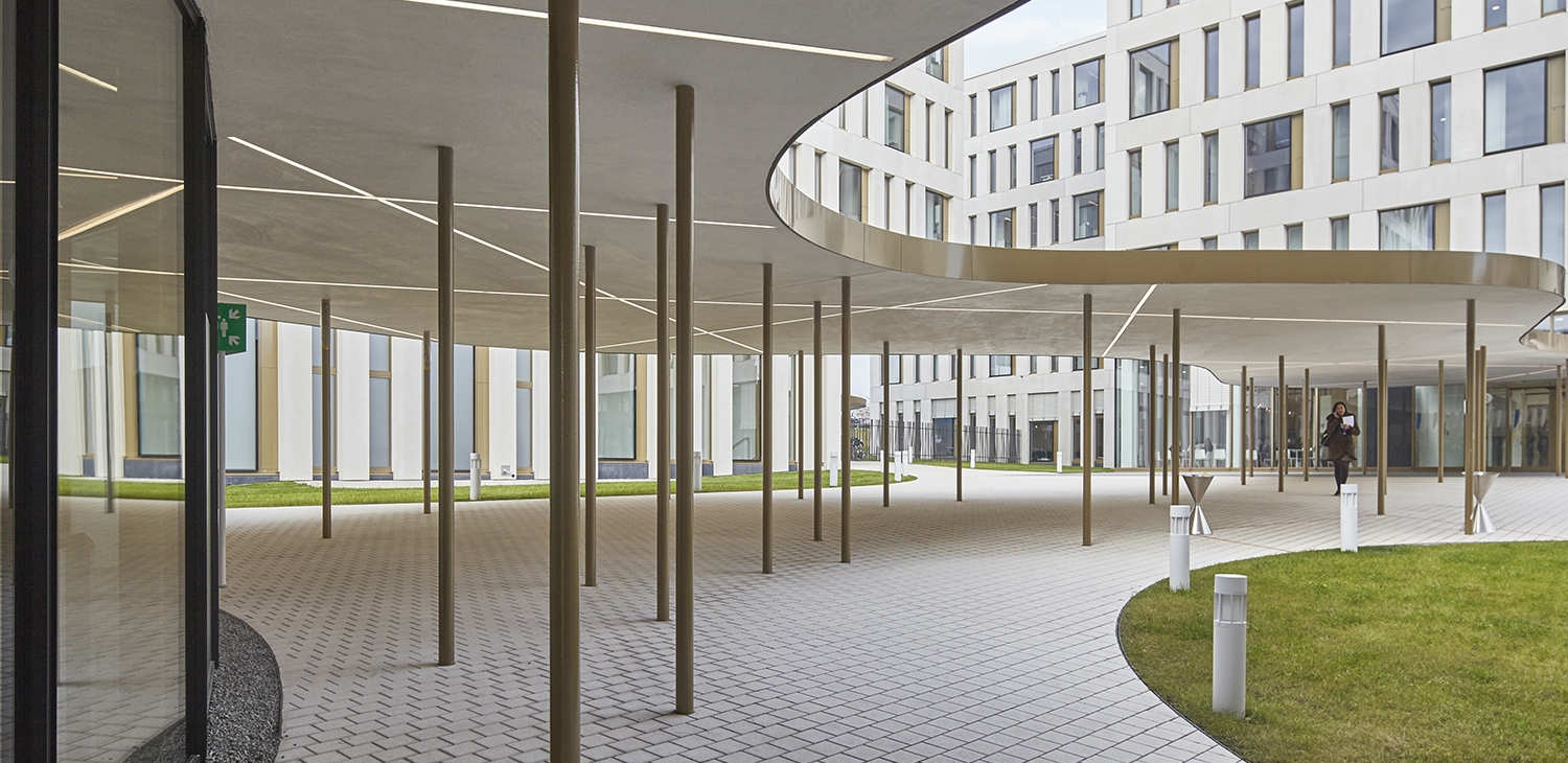 Luxemburg-KirchbergDas IAK „Immeuble Administratif Kirchberg“ ist vom „Fonds de compensation commun au régime général de pension” an die Europäische Investitionsbank (Banque Européenne d’Investissement) für die kommenden 9 Jahre vermietet worden. Im Rahmen der hierfür getätigten Umbauarbeiten ist ein Empfangspavillon und Überdachung aus Glas und Stahl zwischen den Gebäuden A, D und B erbaut worden. Das Projekt setzt sich aus zwei Teilen zusammen, wobei der erste der ellipsenförmige Pavillon ist, der mit raumhohen Glasfassaden rundum geschlossen ist. Der Pavillon dient als Empfang, über den man in jedes