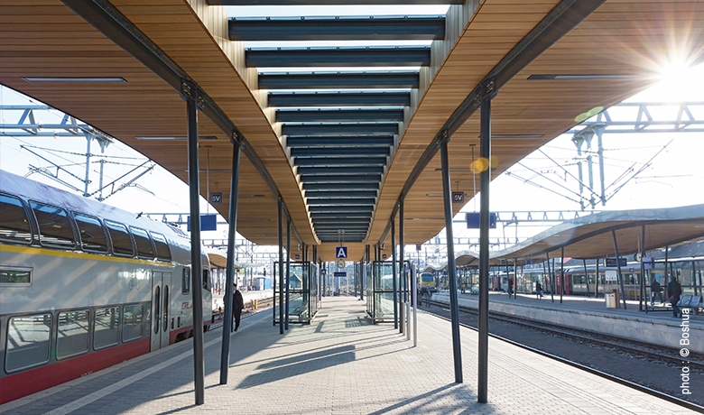 Le choix du matériau bois pour la sous-face des vagues contraste avec les éléments minéraux des quais et l’acier de la structure portante, créant une ambiance agréable pour les voyageurs qui attendent leur correspondance sur les quais.