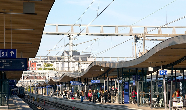 La vague en tant que métaphore du mouvement, représentée par le trafic ferroviaire, a servi de leitmotiv pour la conception des marquises. Elle est portée par deux fils de supports métalliques inclinés, créant ainsi deux espaces latéraux de circulation proches des trains et un espace d’attente au milieu.