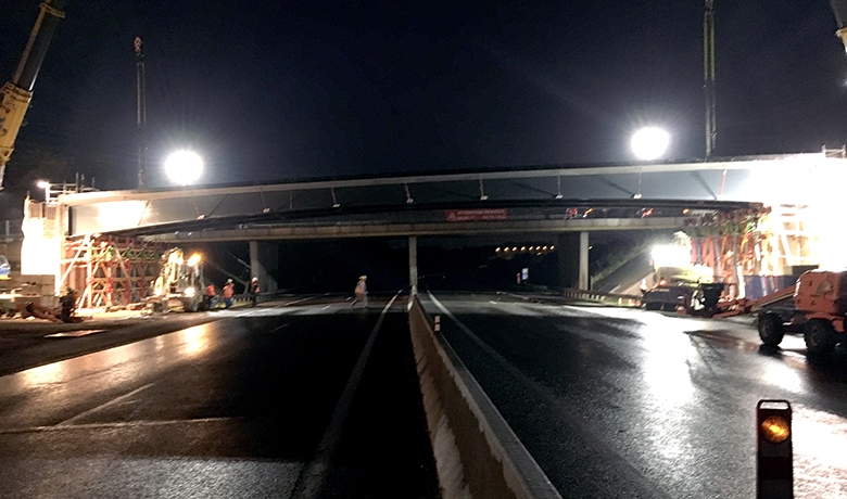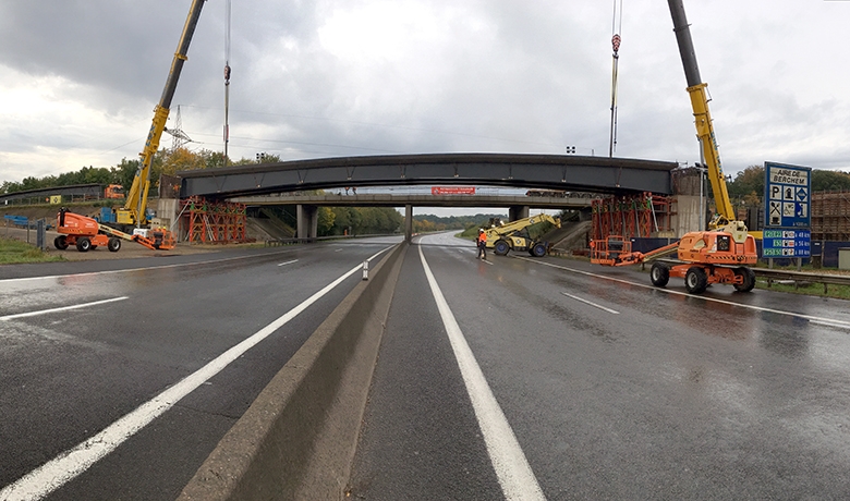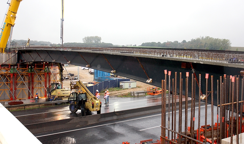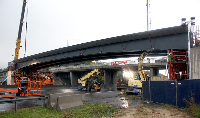 25 m au-dessus des futurs chemins de fer et constituée de poutrelles enrobées de béton et l’autre de 45 m au-dessus de l’autoroute, en respectant un futur élargissement de l’autoroute. Il  est composé de cinq poutres mixtes préfabriquées (PMP).