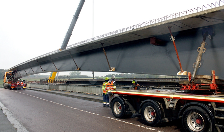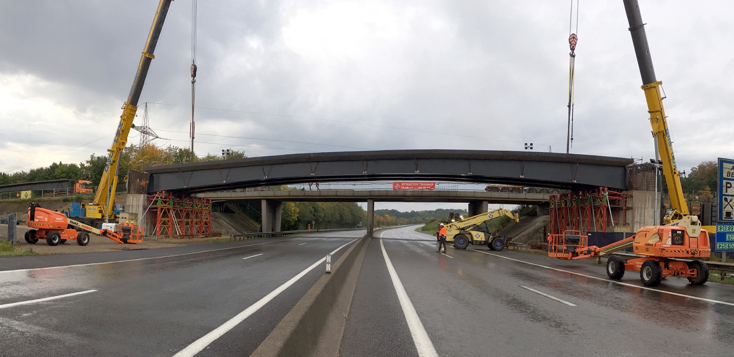 Il s’agit de poutres reconstituées soudées avec une hauteur variable (2,0 à 1,2 m en mi- travée), sur laquelle est bétonnée en usine une prédalle collaborante, servant de coffrage pour un 2e béton coulé sur place. L’avantage est de réduire au maximum la perturbation du trafic lors de la construction de l’ouvrage. Ainsi un seul barrage de l’autoroute de 1 week-end était nécessaire pour poser les poutres. Les poutres étaient préfabriquées en Allemagne et transportées au Grand-duché, où elles étaient posées par deux grues mobiles 300 to.