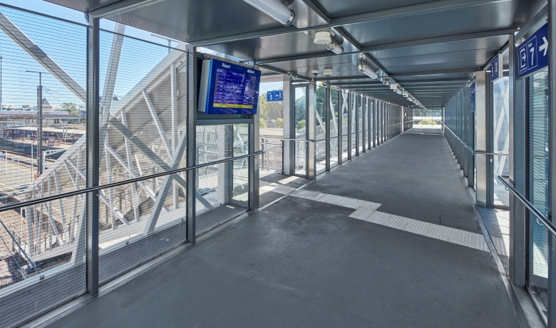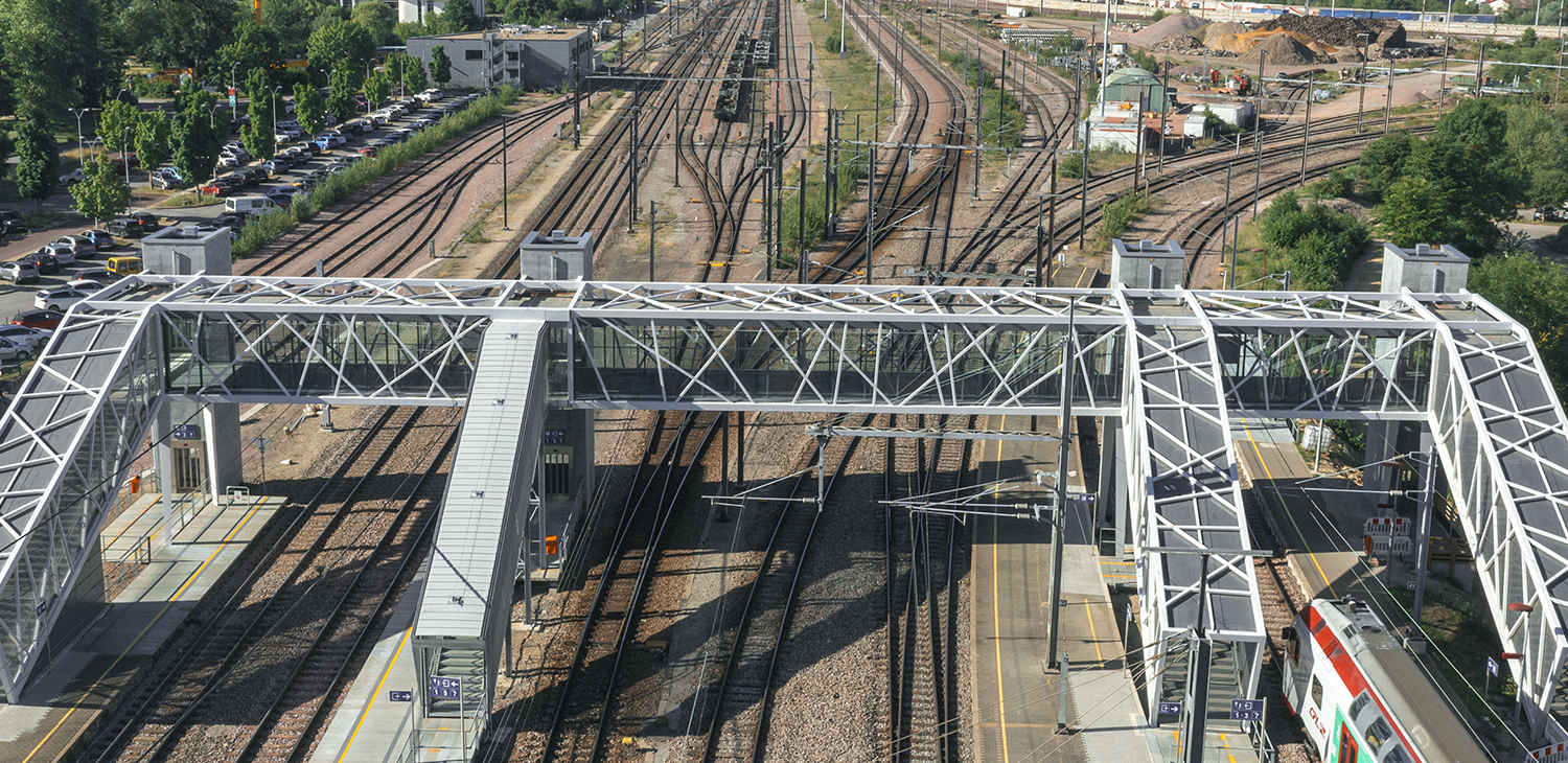 La structure portante de la passerelle est conçue en treillis à géométrie irrégulière visant à répartir la matière là où il y a un besoin statique, intégrant un mouvement ludique dans un milieu linéaire constitué de voies et de quais. La recherche de ce contraste met en valeur la nouvelle liaison.