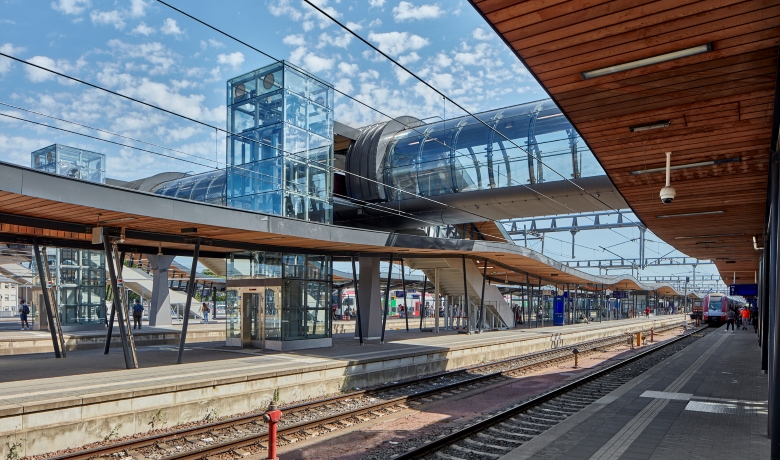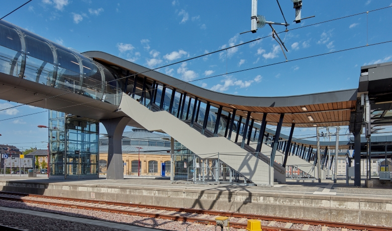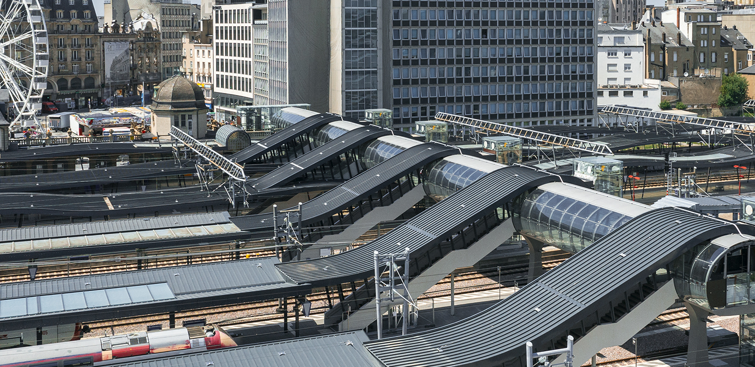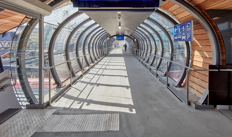 La nouvelle passerelle fait partie intégrante des nouvelles marquises sur les quais. L’ondulation de la vague constitue une métaphore du mouvement. Celle-ci est reprise dans la toiture des marquises avec des vagues asynchrones de quai en quai. Au droit de la passerelle, la vague prend de l’ampleur venant ainsi envelopper le tube translucide du nouvel ouvrage. L’escalier vient s’intégrer sous cette nouvelle vague. Vis-à-vis de l’escalier se trouve l’ascenseur menant sur les quais. Ce prisme translucide est en parfait contraste avec les courbes des toitures et de la passerelle.