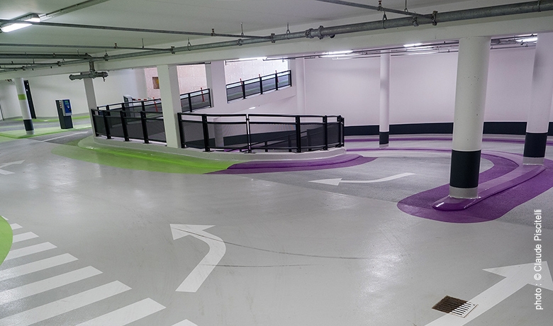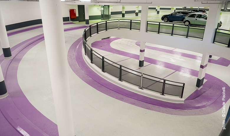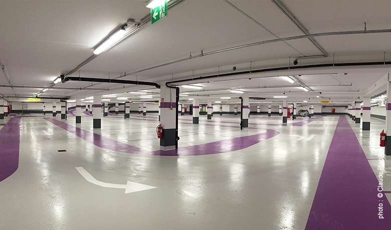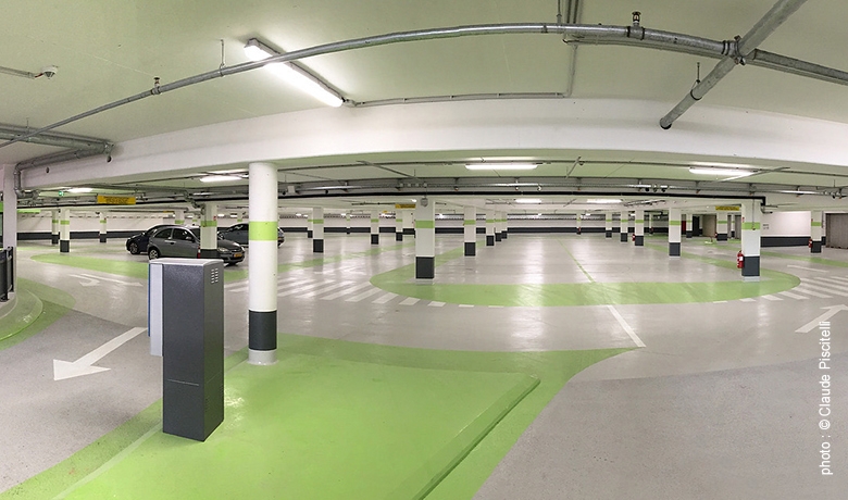 Le parking souterrain comporte 180 places et une structure portante classique en béton armé coulé en place dont l’étanchéité des parties enterrées est réalisée au béton armé à haute résistance contre la pénétration d’eau d’après le principe « weiße Wanne ».