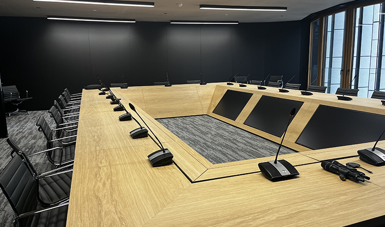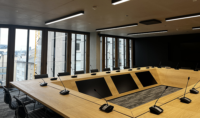Outre l'acoustique, le bureau INCA était également responsable de l'équipement multimédia notamment de la salle polyvalente du E+8 ainsi que pour la boardroom du E+5.