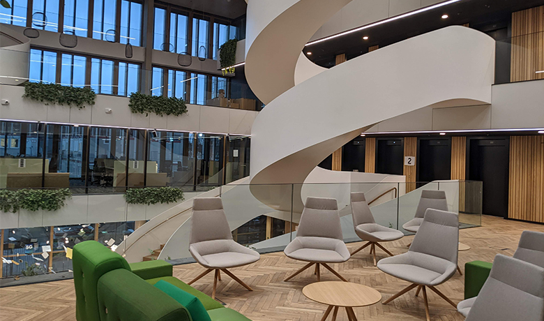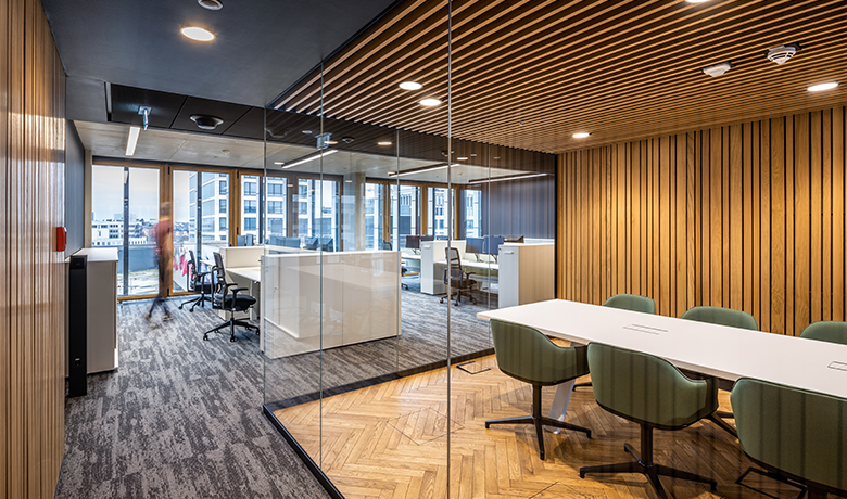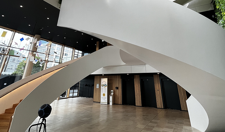 En revanche, des panneaux verticaux acoustiques en bois sur mesure ont été développés avec l'architecte, testés en laboratoire et intégrés au projet. Dans les espaces de bureaux, on retrouve des cloisons avec une forte proportion de verre difficiles à insonoriser. De nombreux détails de raccordement ont dû être développés par notre département, de sorte que la qualité de l'isolation acoustique puisse être efficacement garantie.