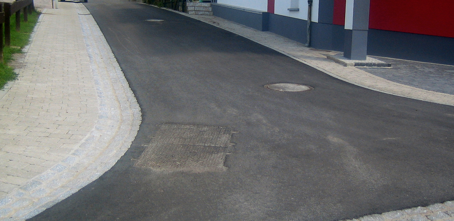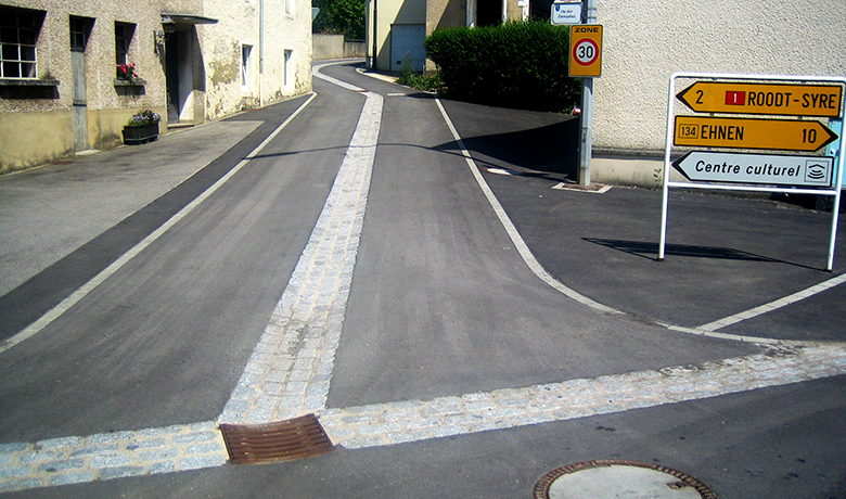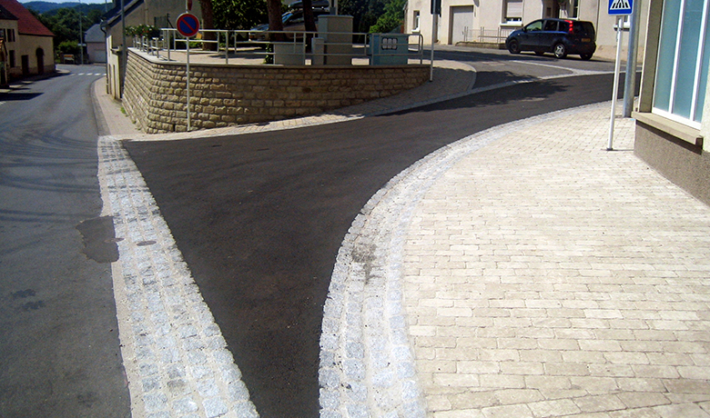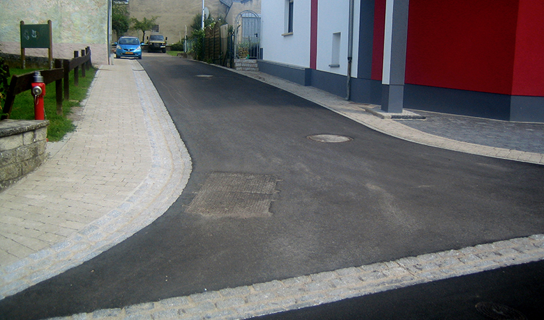 Lors du réaménagement des surfaces, les bordures existantes en pierre de rivière ont été remplacées par un caniveau plein à 4 lignes en pierres naturelles. En raison des conditions relativement étroites dans la rue "Op der Danzplaz", le nouveau caniveau se trouve au milieu de la rue. Les surfaces de la chaussée ont été revêtues d'une couche de liaison de 6 cm et d'un revêtement de fermeture de 4 cm. Afin de mettre davantage en valeur le caractère villageois des rues rénovées, les trottoirs ont été réalisés avec un bloc de béton concassé d'aspect naturel (type "Réimerwee").