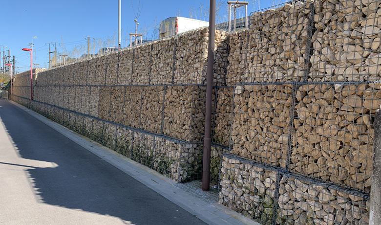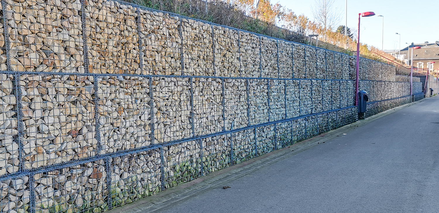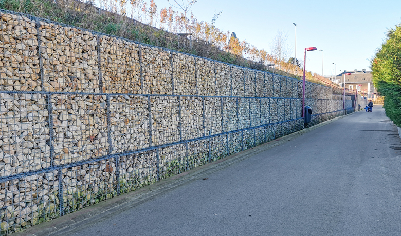 Suite à l’apparition de nombreuses fissures dans l’enrobé de circulation et suite à des instabilités locales du talus à cause de sa pente trop importante et des murets en pierre naturelle en mauvais état, les CFL et la commune de Pétange ont convenu de stabiliser le talus par la construction d’un mur en gabions de 3 à 4 rangées d'une longueur de 250 m et d'une hauteur de 3,5 mètres.