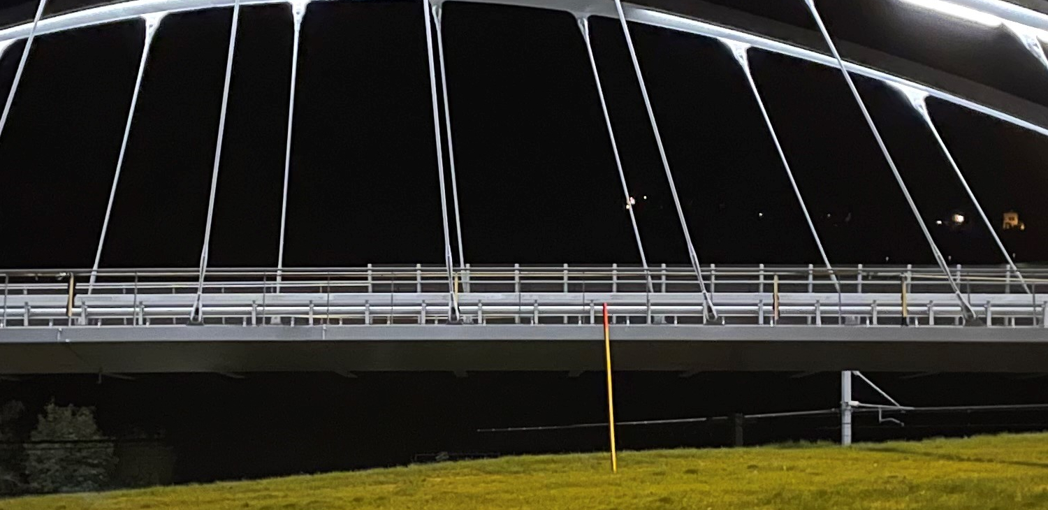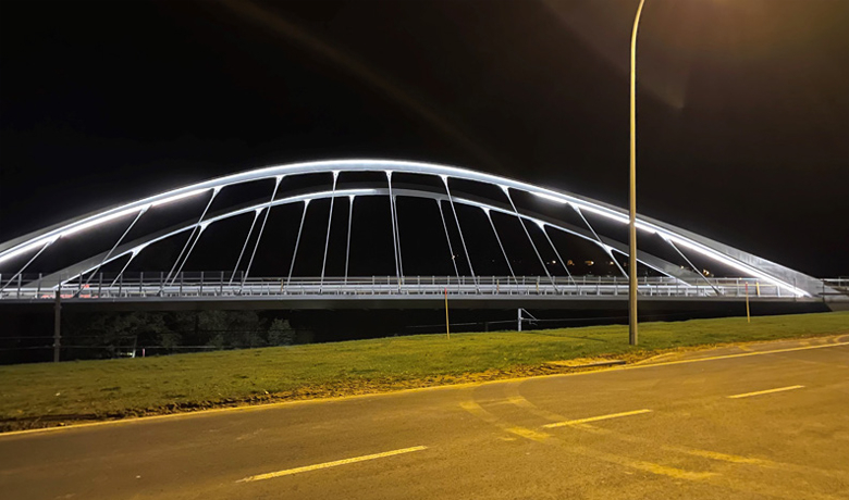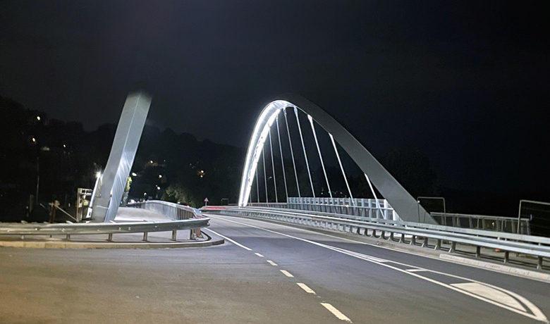 Une structure de type Bow-String a été retenue et permet de s’affranchir d’un appui intermédiaire, pour une longueur d’ouvrage entre appuis de 68m. Un éclairage intégré aux deux arcs illumine l’ouvrage. Sa largeur de 16,50m accentue les possibilités de mobilité douce entre les deux villes.